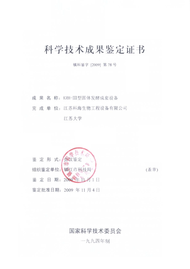 热竞技平台下载与江苏大学联合研发“KRH-III型固体发酵成套装备”产品,由“镇江市科技术局” 、“江苏省经济贸易委员会”联合组织鉴定,鉴定圆满成功。证书编号:镇科鉴字(2009)第78号、苏经