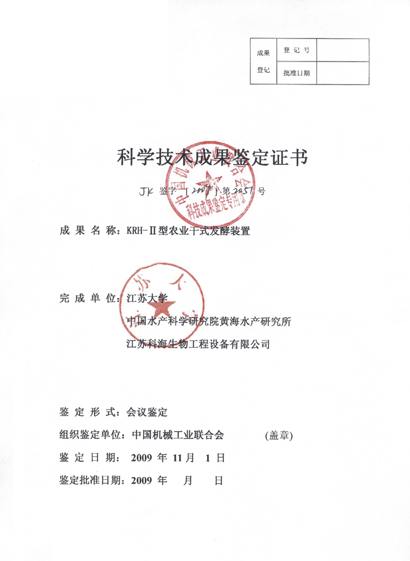 热竞技平台下载与中国水产科学研究院黄海水产研究所、江苏大学联合研发“KRH-II型农业干式发酵装置”产品,由“中国机械工业联合会”组织鉴定,鉴定圆满成功。证书编号:JK鉴字(2009)第2051