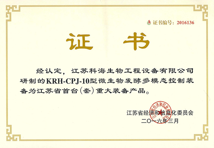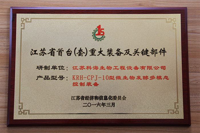 热烈庆祝江苏科海研制的“KRH-CPJ-10型微生物发酵多模态控制装备”荣获“江苏省首台套重大装备及关键部件”荣誉称号